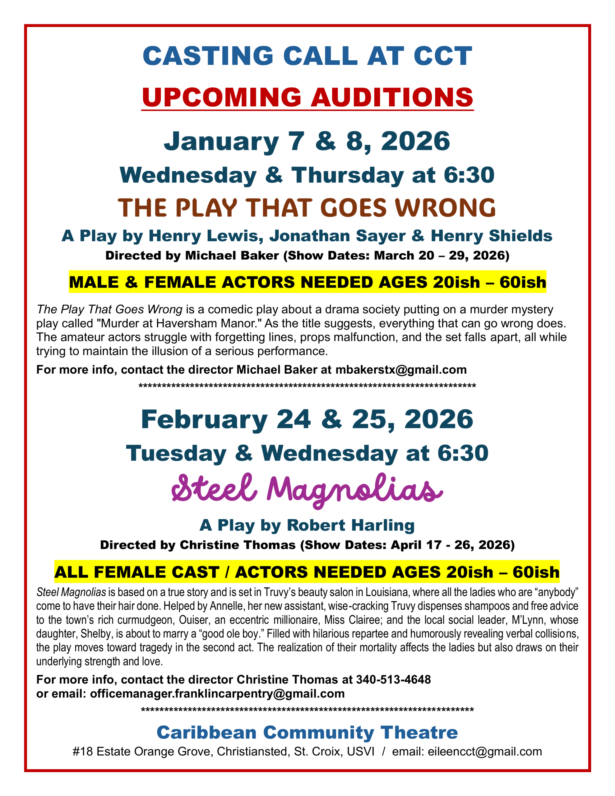 UPCOMING AUDITIONS AT CCT